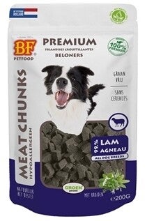 BF Petfood Meat Chunks 200 gram zijn aanvullende snacks voor de hond, heerlijke hypoallergene, licht verteerbare premium beloningssnack met puur vlees en een laagje kruiden. Gezond en ronduit onweerstaanbaar, dat zijn deze krokante vleesbeloners van BF Petfood (voorheen Biofood)! Deze heerlijke snacks zijn rijk aan puur vlees met een laagje kruiden en een krokante bite. En bovendien gezond, want naast koolhydraatvrij zijn de snacks graan- en glutenvrij én hypoallergeen! Daarnaast zijn de snacks 100% natuurlijk, bereid zonder kunstmatige toevoegingen. Ook geschikt voor honden met gevoelige spijsvertering dus! Een verantwoord tussendoortje dat ook nog eens vriendelijk voor het milieu is, want door het duurzame droogproces zijn de snacks geproduceerd met zo min mogelijk afvalproducten en CO2-uitstoot, en de verpakking is 100% recyclebaar. Een perfect tussendoortje of beloning!