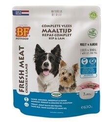 BF Petfood vleesvoeding is een natuurlijke, volledige en houdbare hondenvoeding op basis van verse kip, zalm, orgaanvlees, rijst, schapenvet en natuurkruiden. Is uitermate geschikt voor vleesdagen, als traktatie, voor onderweg, smaakmaker, bij omschakeling naar ander voer of voor honden die slecht reageren op droogvoeding. Met afsluitbare verpakking en handige portieverpakkingen (7x90g/630g). Geschikt voor iedere hond, van pup tot senior. Ook te verkrijgen als 800 g worst.