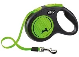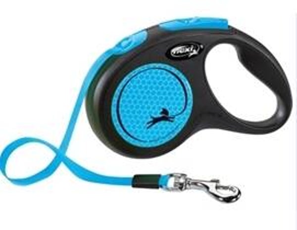 De Flexi Rollijn New Neon Tape Zwart / Neon kleur is een handige, opvallende looplijn met band op rolmechanisme voor honden. Deze nieuwe uitvoering springt er lekker uit! De behuizing van de Flexi is zwart, met details in een felle blauwe contrastkleur. De lijn bestaat uit een stevige platte band met musketonhaak op rolmechanisme, waardoor de hond meer ruimte heeft om te lopen. Met de knop bovenop kun je de lijn afremmen of terughalen. De zijkanten zijn reflecterend voor meer zichbaarheid. Een handige, opvallende rollijn van de bekende Flexi-kwaliteit die de hond lekker veel bewegingsruimte biedt!