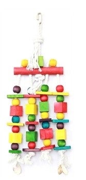 Perfect speelgoed voor papegaaien en andere grote vogels, dit speelgoed combineert vormen en kleuren om het natuurlijke kauw, versnipper en speelgedrag aan te moedigen. Met behulp van de sterke metalen haak kunt u het speelgoed gemakkelijke in kooi bevestigen. De felle kleuren daagt ze uit om het speelgoed te verkennen met snavel en poten.